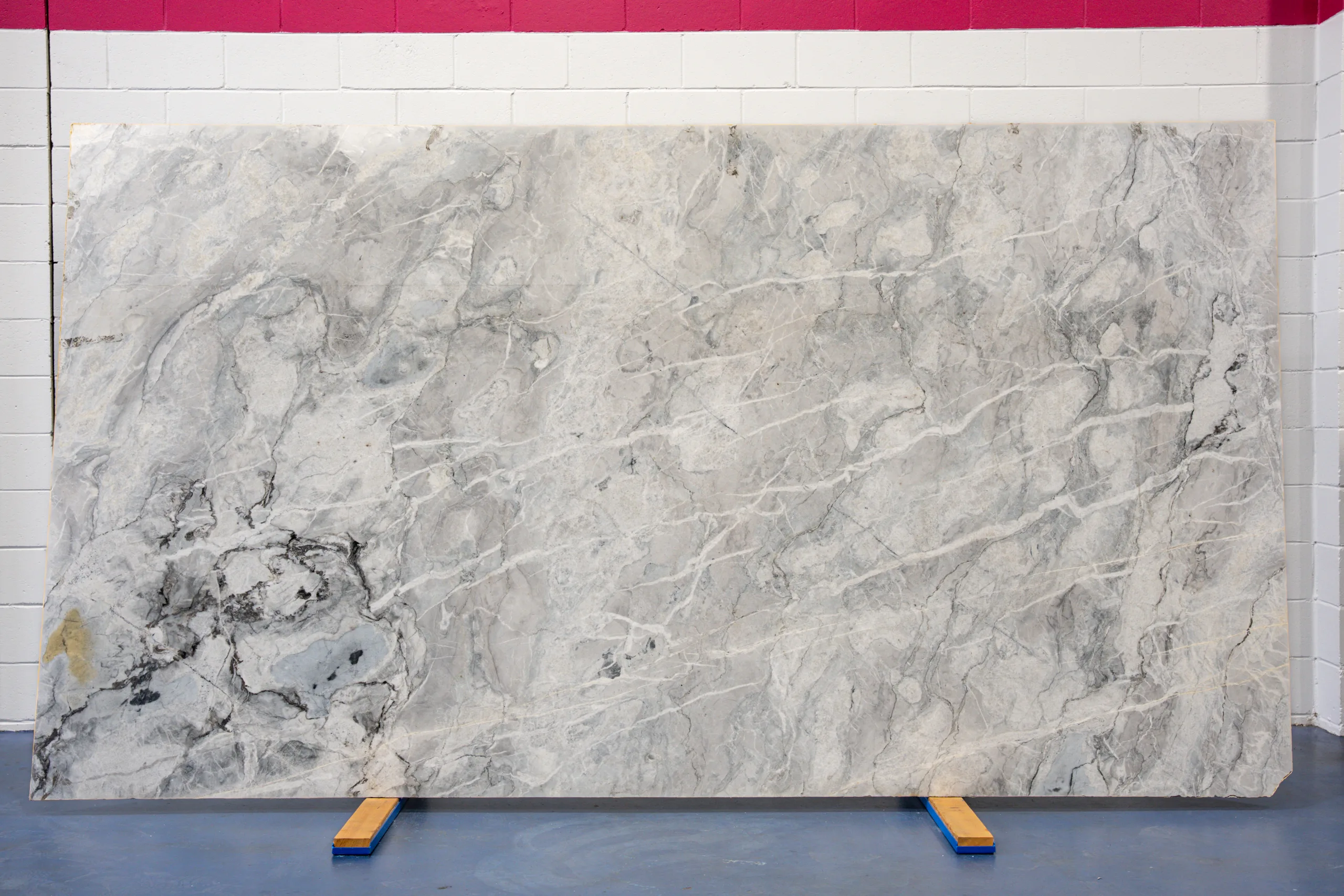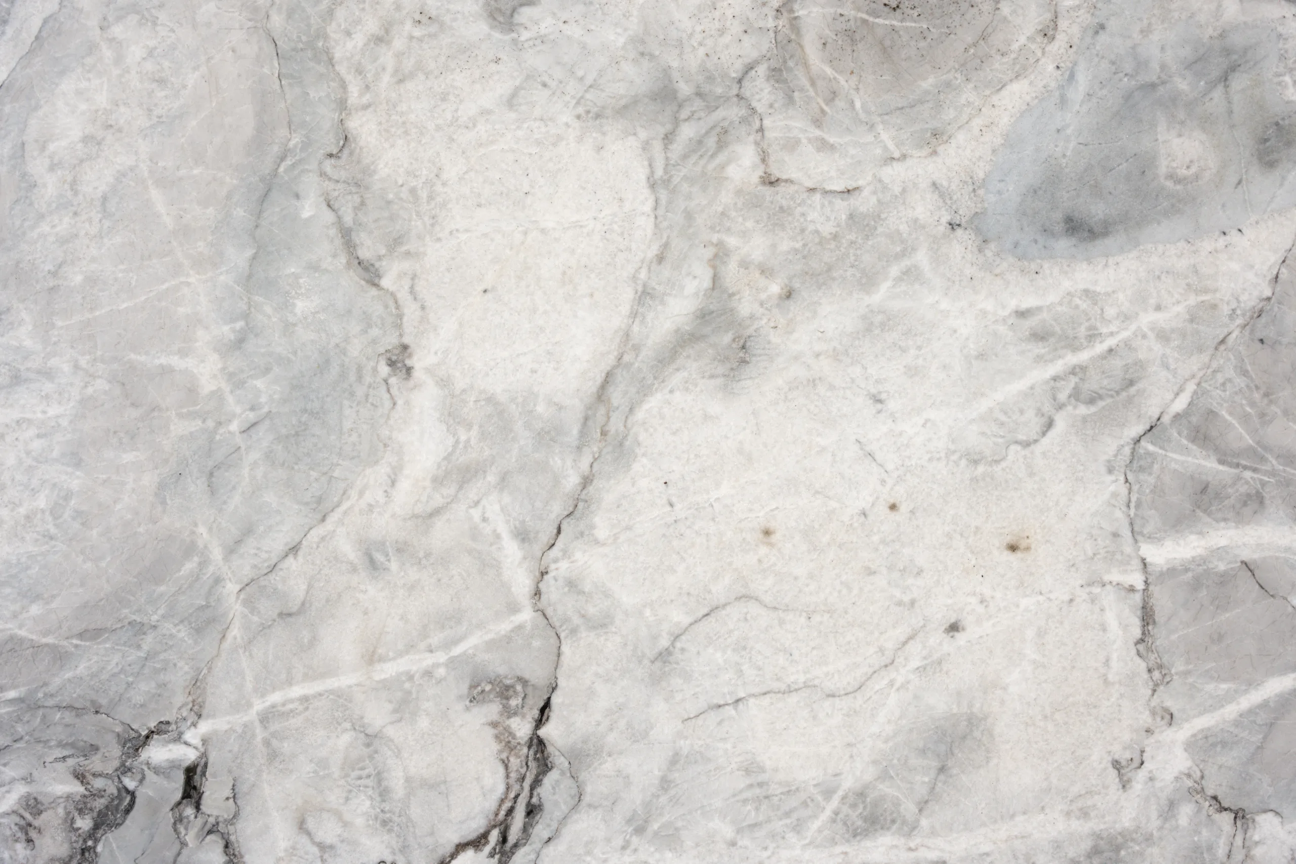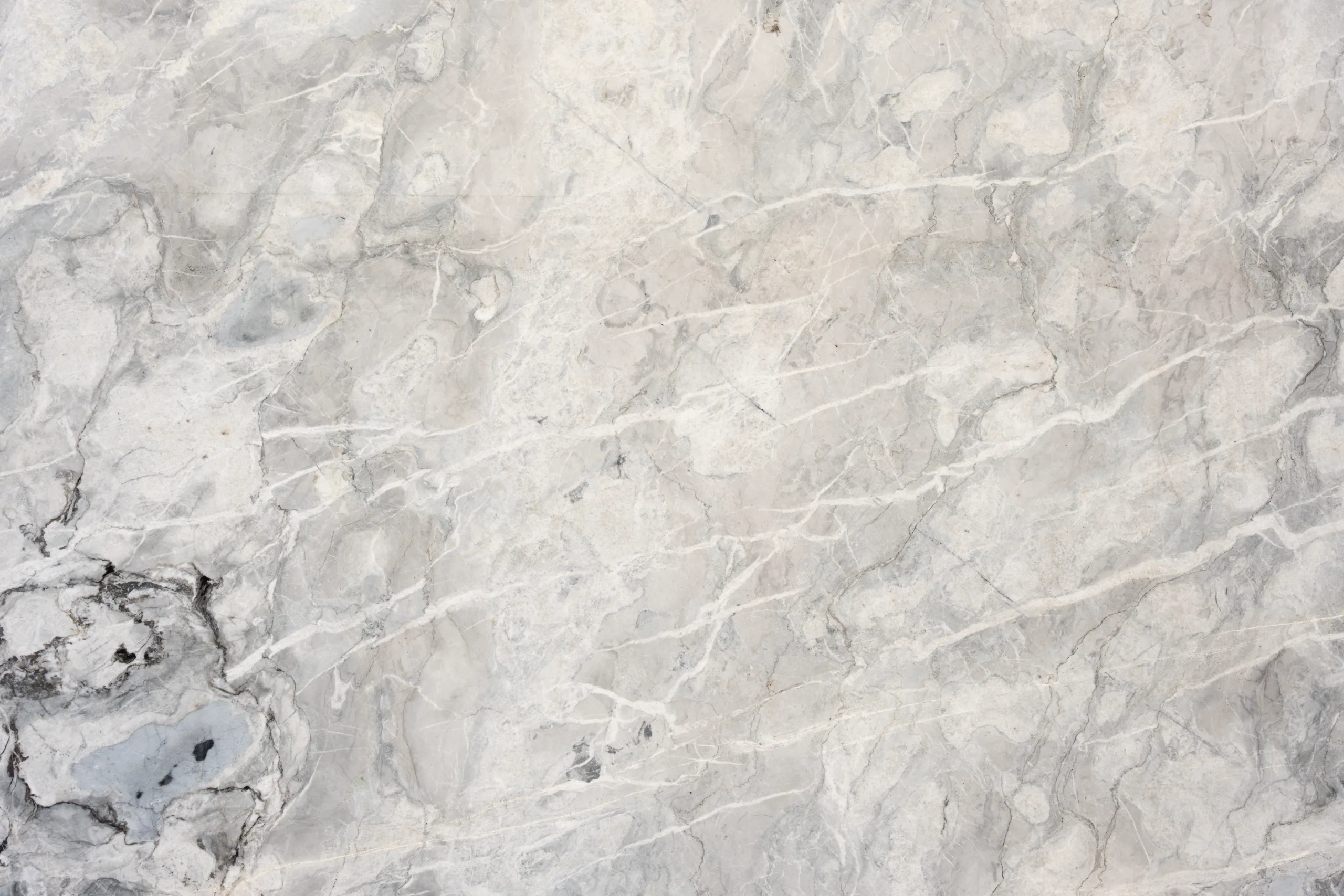 Selected for its layered mineral movement and cool tonal range, Arctic Ice is a natural quartzite featuring a soft grey and white base with subtle blue undertones and fine crystalline veining. Broad areas of clouded texture move across the slab, intersected by lighter linear veins and occasional darker mineral concentrations that add depth and natural character. The scale of the pattern allows the stone to read as calm from a distance while revealing detail up close.