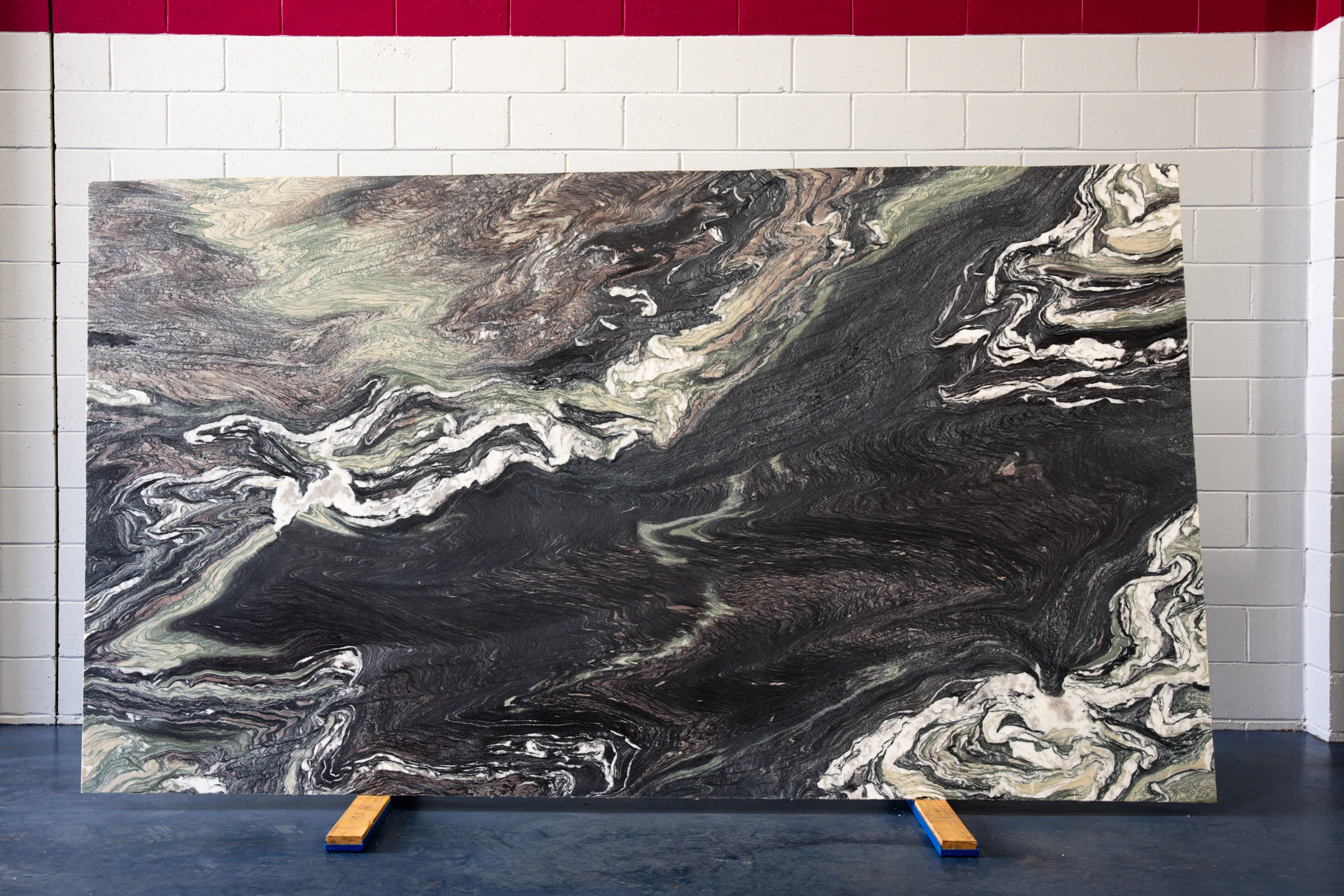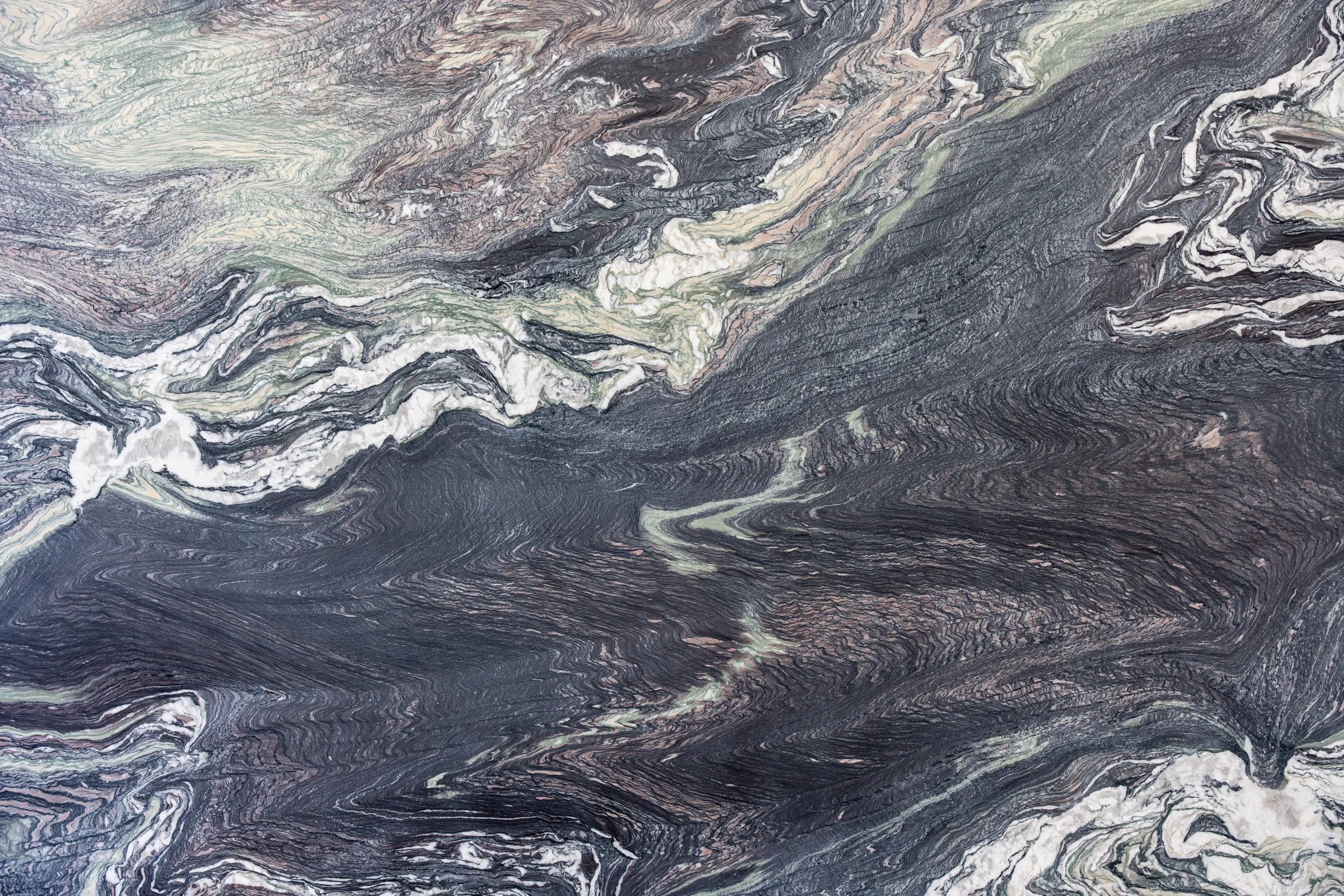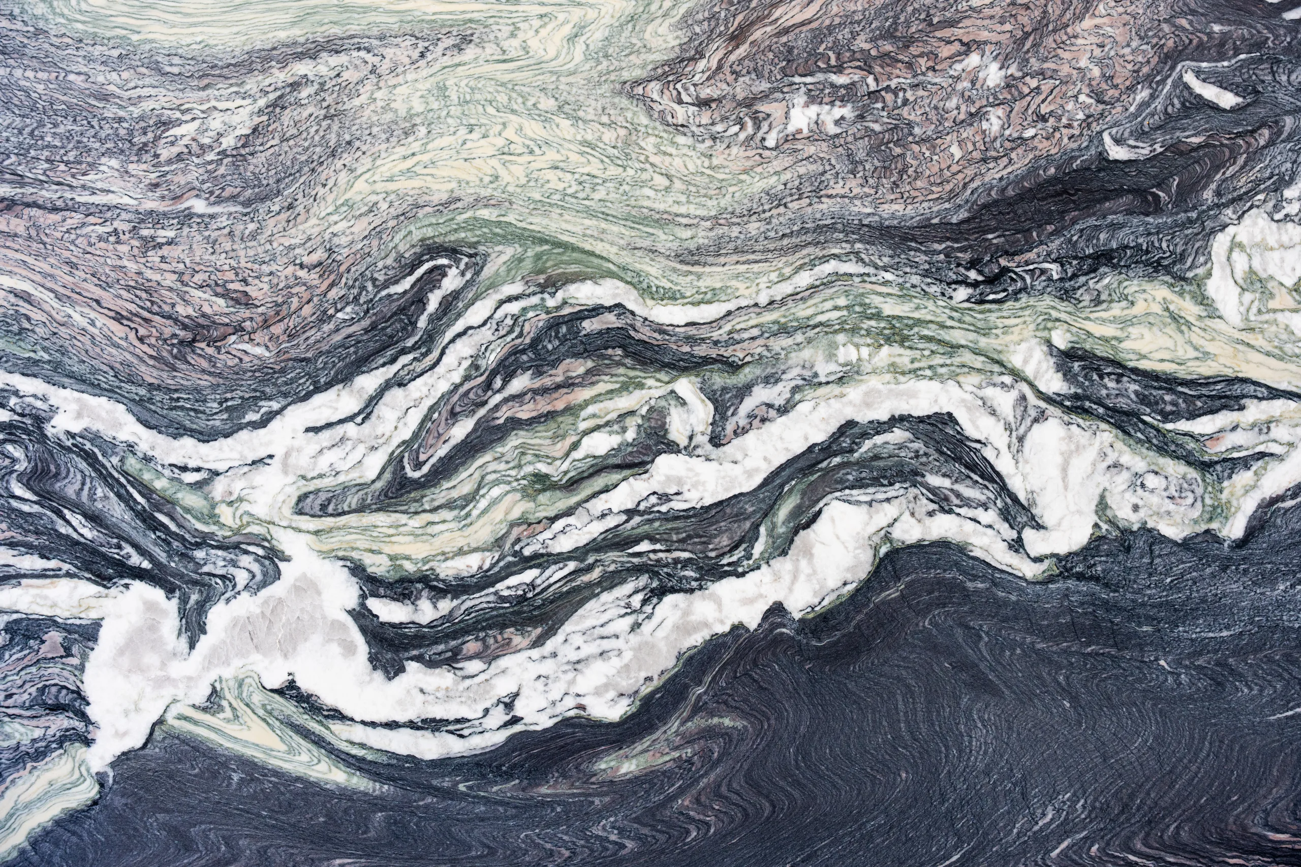 Selected for its distinctive layered structure and complex mineral movement, Cipollino Undulato Rosso is a natural marble characterised by flowing bands of charcoal, soft green, warm taupe and white. The stone displays sweeping, undulating formations that move across the slab in broad directional patterns, with fine linear banding and crystalline white marble sections creating contrast and depth. Subtle green tones and warmer mineral layers give the material a varied palette while maintaining a cohesive natural structure.